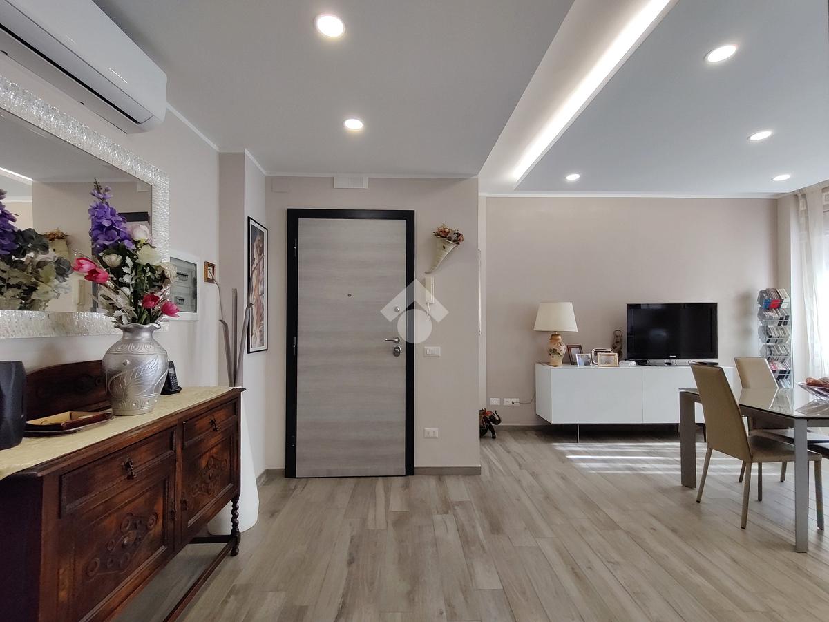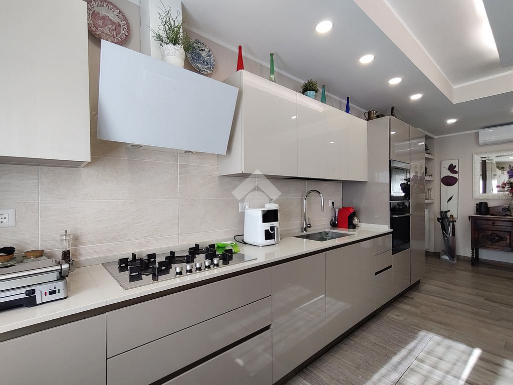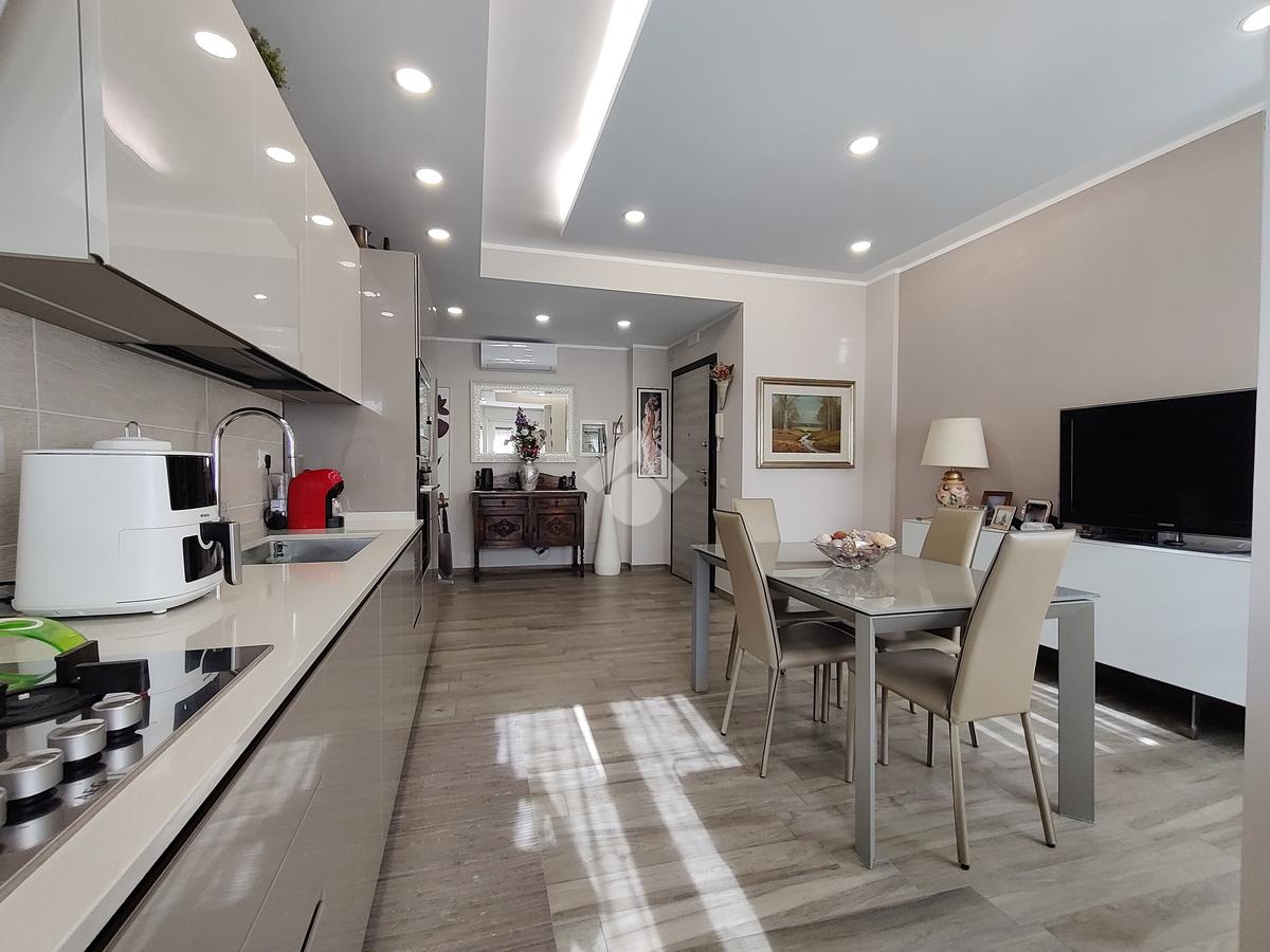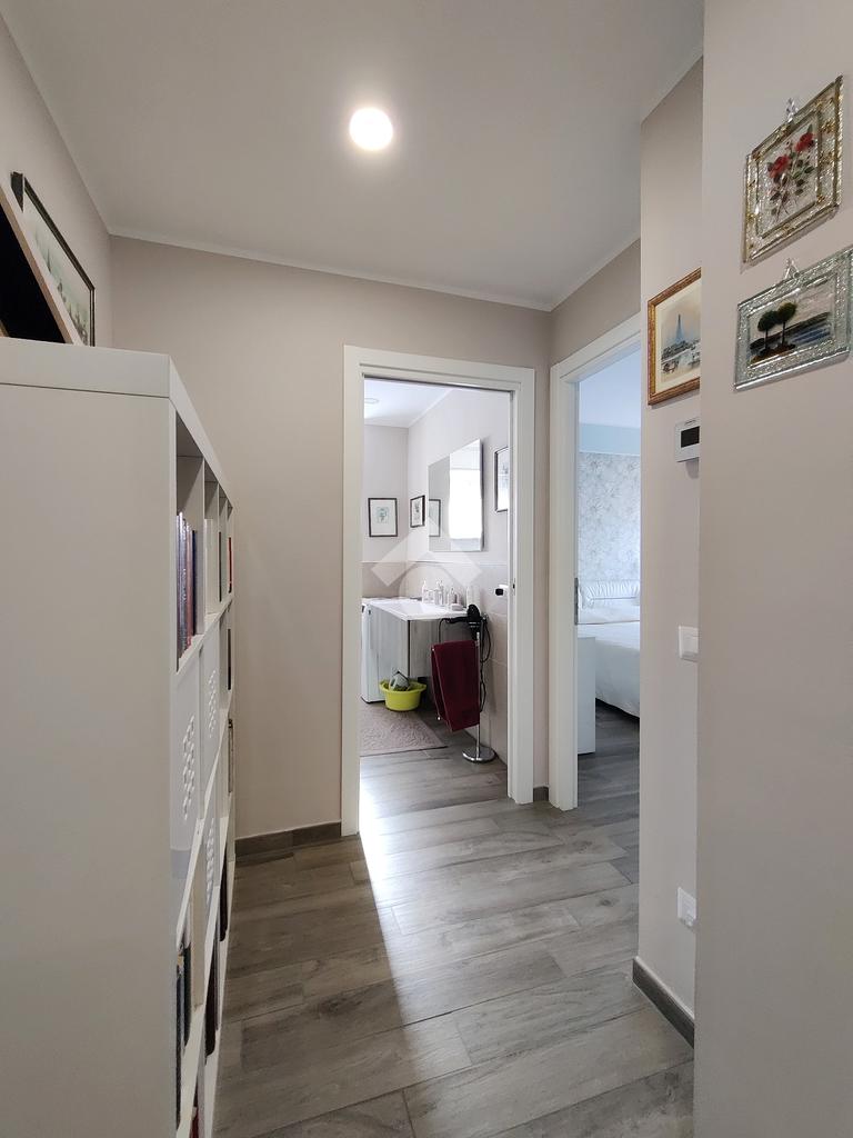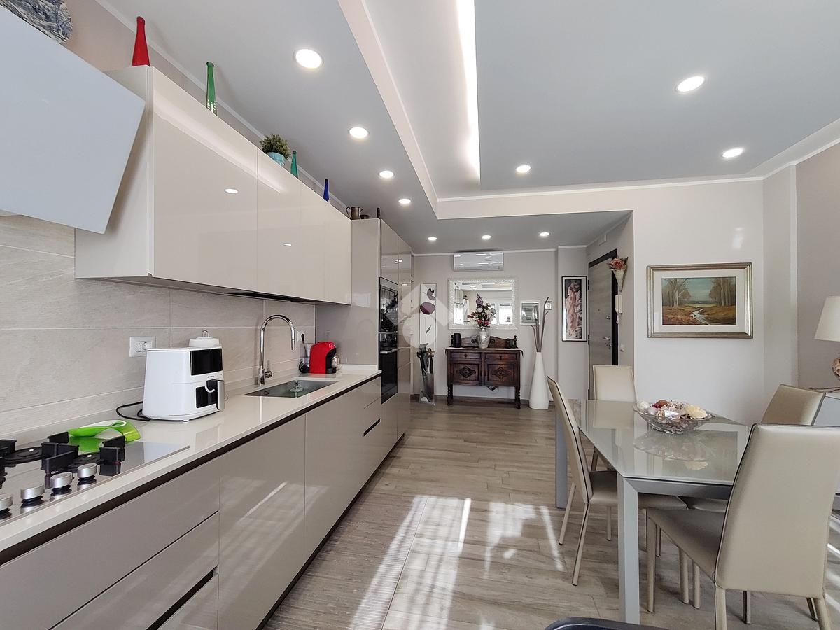 L'appartamento presenta finiture di qualità, tra cui infissi Finstral in PVC, avvolgibili elettrici, zanzariere, tende da sole, pavimentazione in gres porcellanato effetto parquet uniforme in ogni stanza, climatizzatori in tutti gli ambienti, riscaldamento autonomo con caldaia a condensazione, porta blindata, porte interne in legno laccato e controsoffitti con illuminazione a faretti integrati.