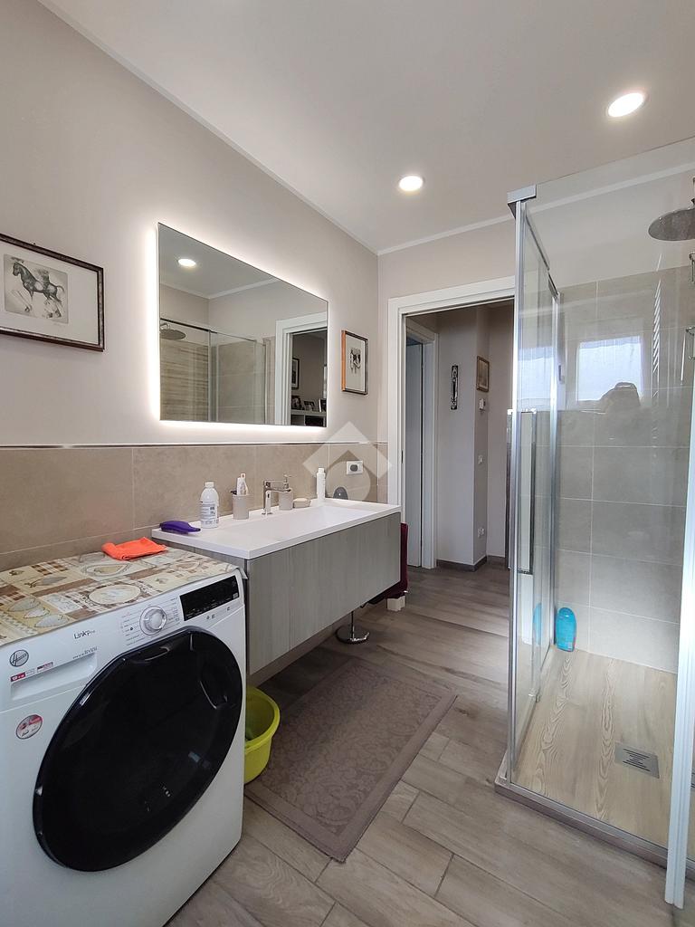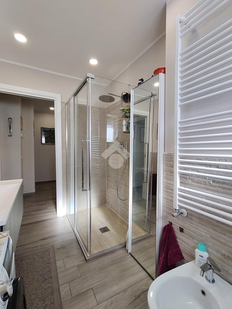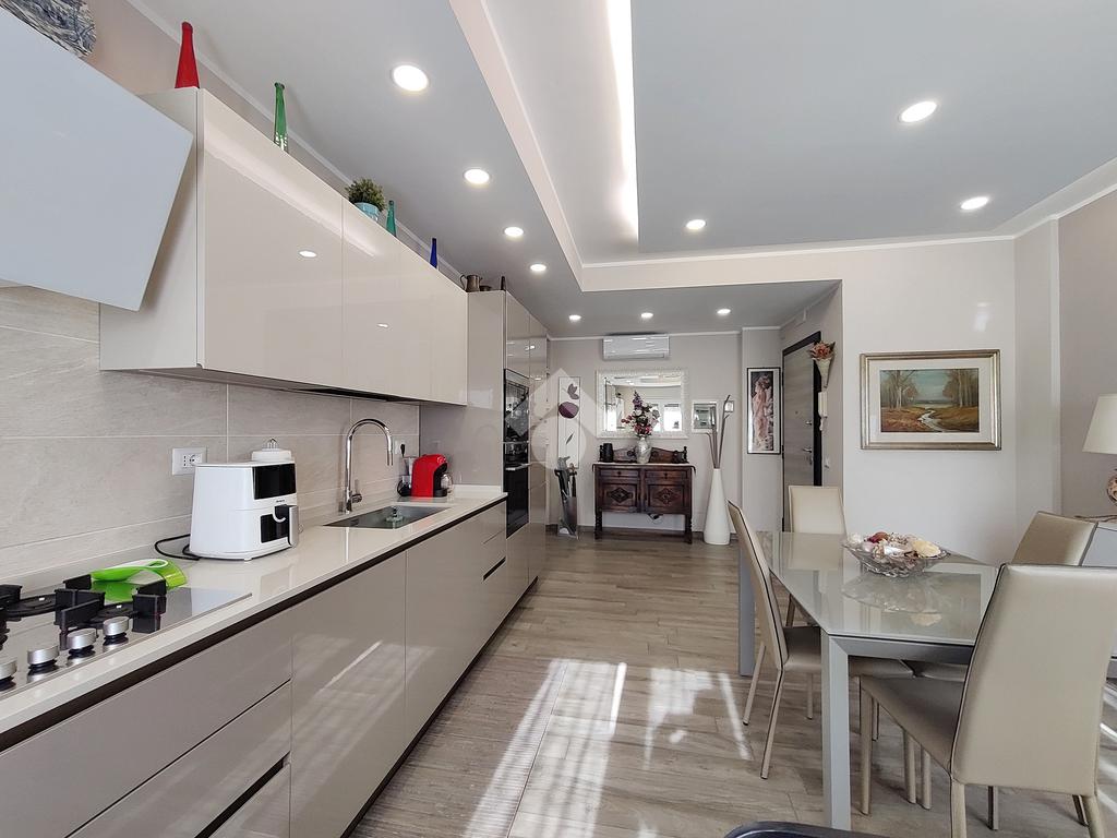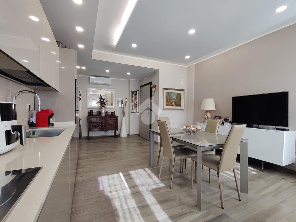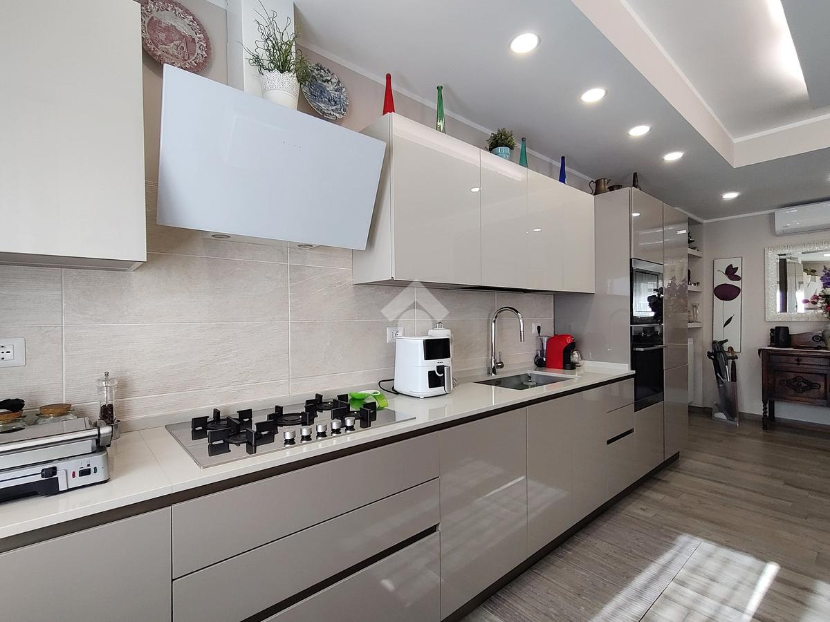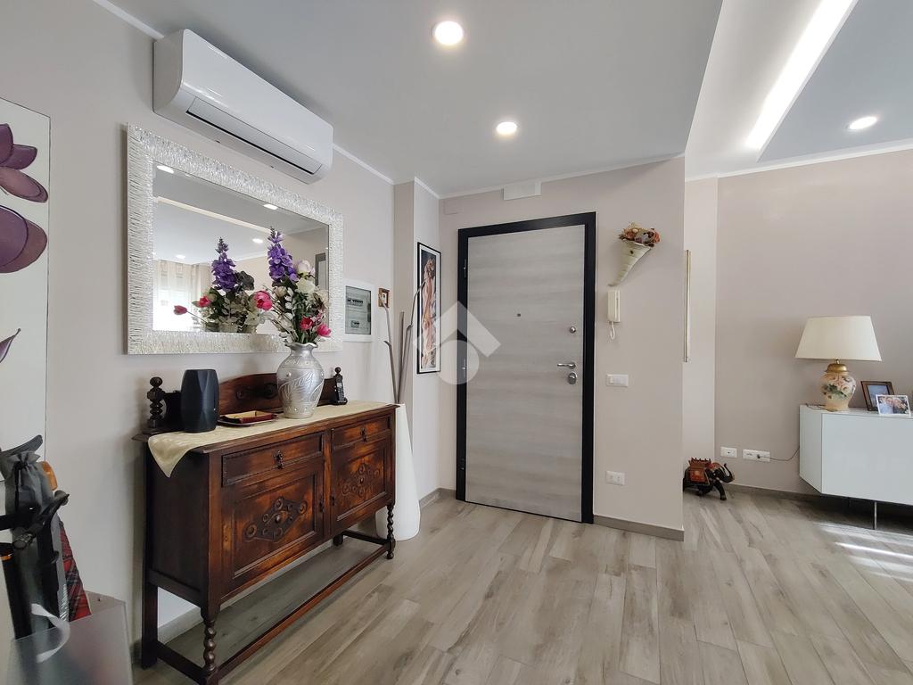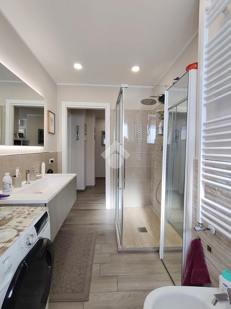 L'appartamento presenta finiture di qualità, tra cui infissi Finstral in PVC, avvolgibili elettrici, zanzariere, tende da sole, pavimentazione in gres porcellanato effetto parquet uniforme in ogni stanza, climatizzatori in tutti gli ambienti, riscaldamento autonomo con caldaia a condensazione, porta blindata, porte interne in legno laccato e controsoffitti con illuminazione a faretti integrati.